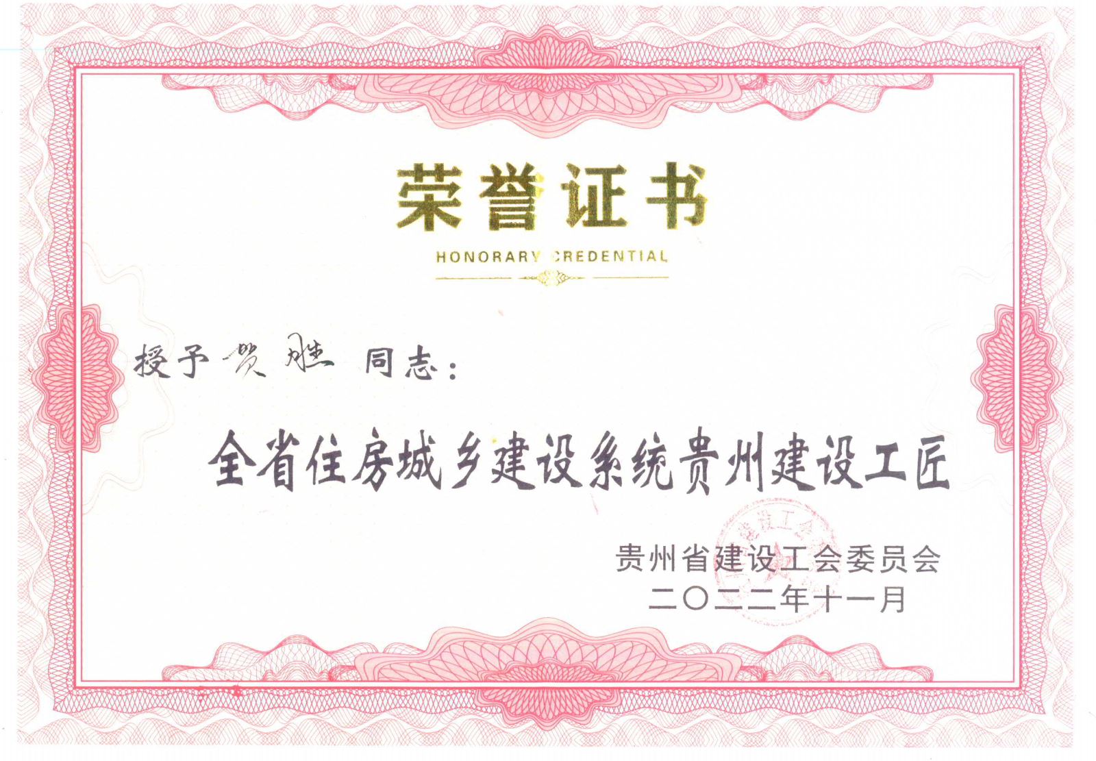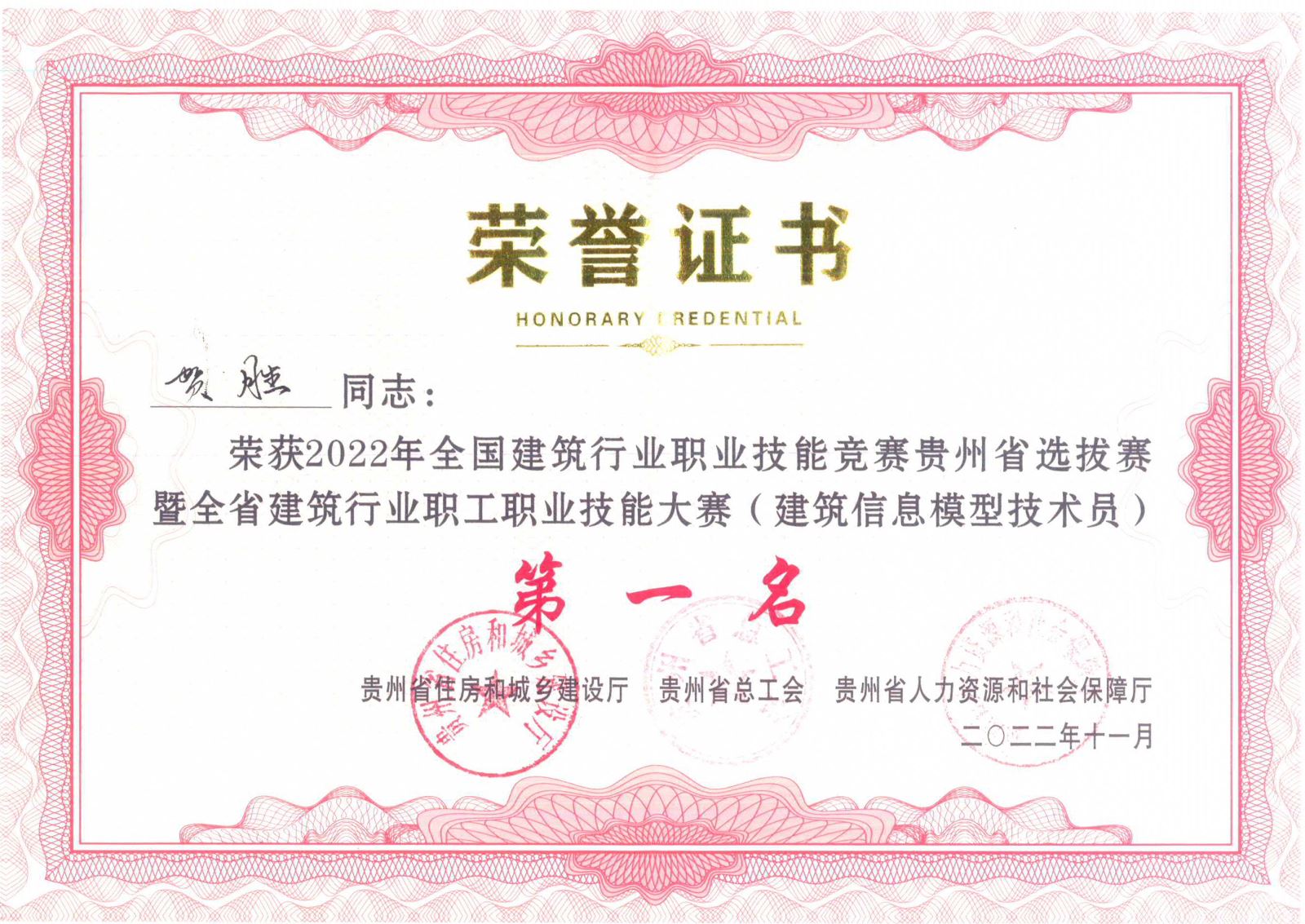 賀勝同志獲得 “建筑信息模型技能大賽”全省第一名,并被授予“全省住房城鄉(xiāng)建設(shè)系統(tǒng)貴州建設(shè)工匠”榮譽(yù)稱號(hào),同時(shí)獲得5000元現(xiàn)金獎(jiǎng)勵(lì)。